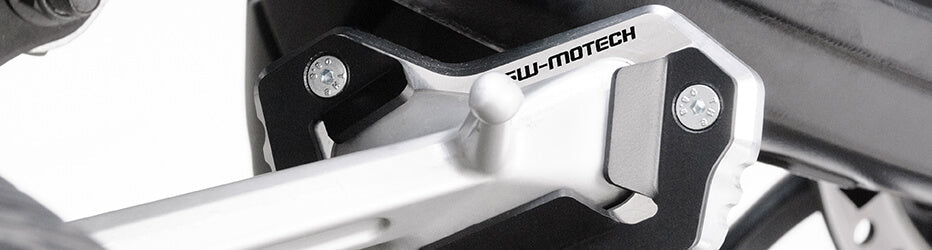 Our side stand foot extensions offer a large contact surface to improve the motorcycles parking footprint on uneven surfaces and soft ground. The grooved upper ledge helps the driver to swing out the side stand easily even while wearing heavy-duty motorcycle boots. For various motorcycle models we offer also offer centerstands.