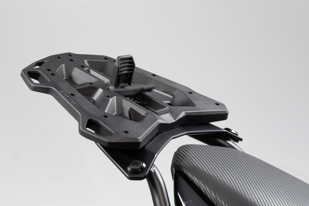 With one simple twist-and-clamp motion, the adapter plate can be connected to any STREET-RACK. No tools required! The adapter plate is simply slid onto the rack and securely locked using the rotating cam latch. After your ride, the adapter plate can be removed in seconds and just the rack stays on the motorcycle. The adapter plate also scores with a large and level contact surface and six large lashing eyes.