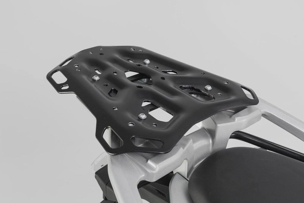 Ready for big adventure: Our ADVENTURE-RACK proves itself with its extreme durability and function-oriented shape. More than 15 years of experience producing racks, combined with feedback from customers and test riders, went into the development of this aluminum rack Material thickness, weight and geometry have been optimized for demanding tours and off-road use. The bike-specific attachments guarantee the best fit and easy mounting on original attachment points. Specifically developed for long-distance enduros, large street and sport touring machines, the ADVENTURE-RACK offers a large contact surface. Numerous, large lashing eyes provide secure hold for tail bags. The functional bores require adapter kits for attaching top cases by SW-MOTECH, Givi, Krauser and Shad or SysBags.