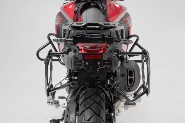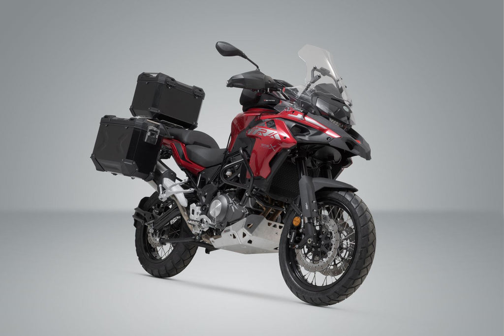 The Adventure set TRAX ADV for the Benelli TRK 502 X includes the PRO side carriers and matching ADVENTURE-RACK. The side carrier and rack are fastened to the bike-specific attachment points and offer sturdy support for the black TRAX ADV aluminium cases.