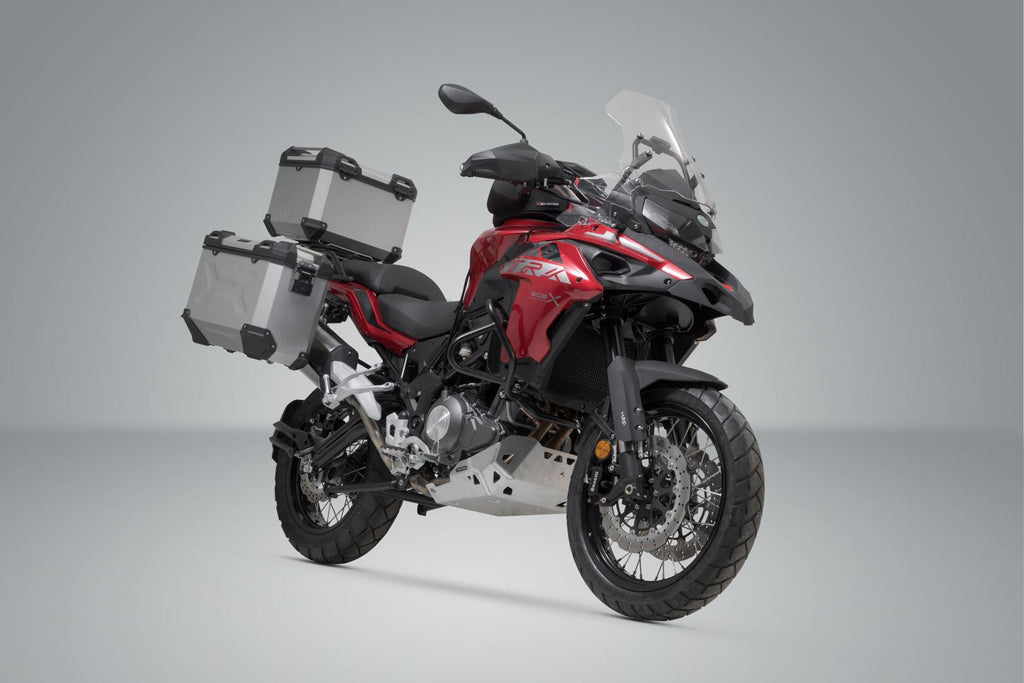 The Adventure set TRAX ADV for the Benelli TRK 502 X includes the PRO side carriers and matching ADVENTURE-RACK. The side carriers and rack are attached to the bike-specific attachment points and offer a secure hold for the silver TRAX ADV aluminum cases.