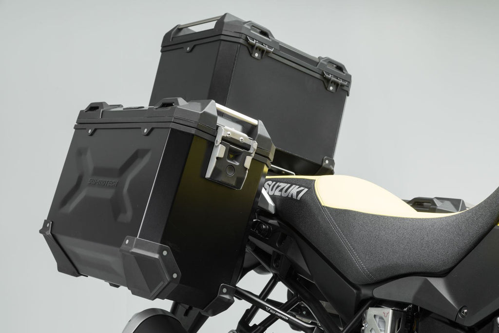 The Adventure set TRAX ADV contains the PRO side carriers that match the Suzuki V-Strom 1000 and the matching ADVENTURE RACK. The side carriers and rack are attached to the bike-specific attachment points and offer a secure hold for the silver TRAX ADV aluminum cases.