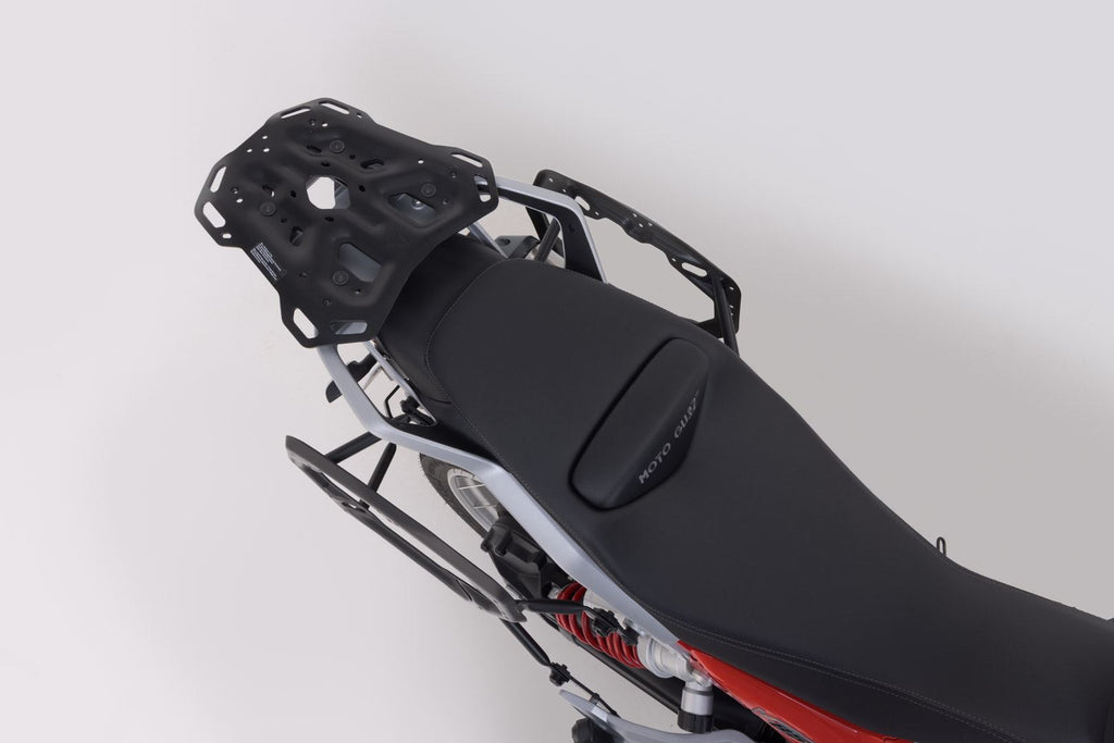 The Adventure luggage set contains the PRO side carriers and the matching ADVENTURE RACK for the Moto Guzzi V85 TT. The side carrier and rack are fastened to the bike-specific attachment points and offer sturdy support for the black TRAX ADV aluminium cases.