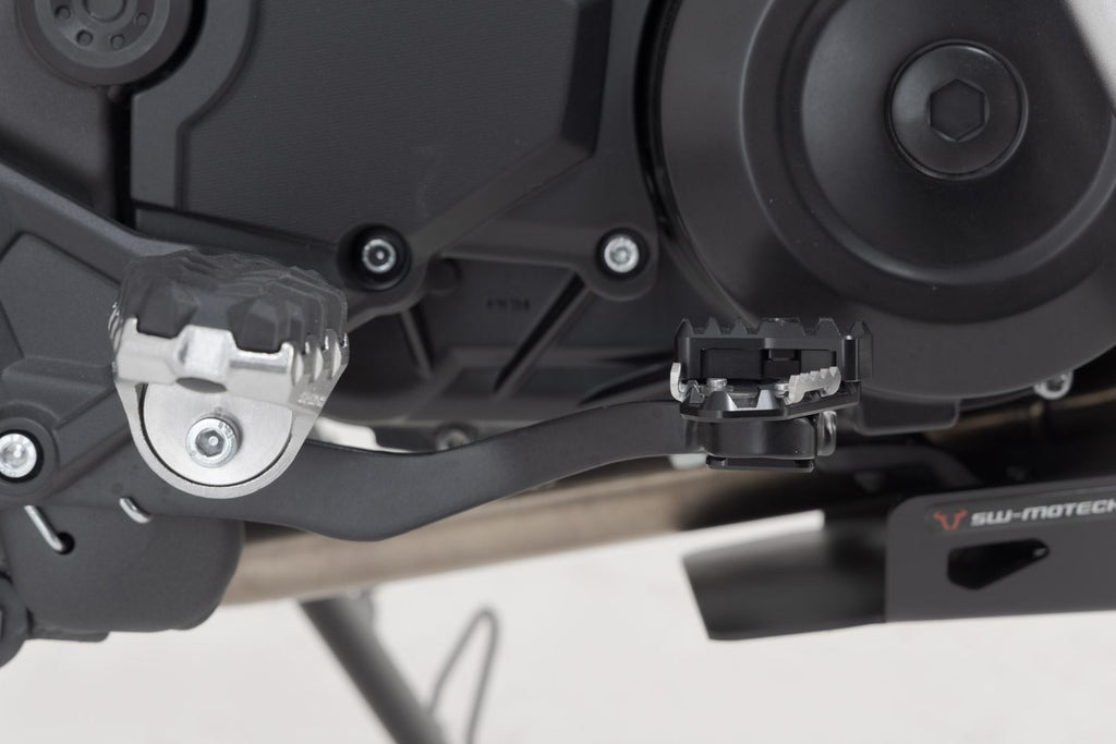 SW-MOTECH manufactures these extensions from high-strength milled aluminum alloy; they feature a black anodized surface and a stainless steel step plate. For optimal ergonomic adjustment, the increase in the brake pedal step can be adjusted in two stages of 22 or 27 millimeters.