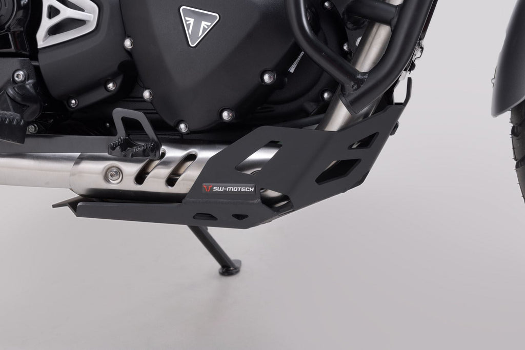 The robust engine guard offers additional protection for the engine and the plastic tank of the Triumph Scrambler 400 X. The 4 mm thick aluminum sheet made of high-quality aluminum alloy can protect the engine from stone chips and scratches if the motorcycle comes in contact with the ground. Thus, it offers increased safety and an individual look.