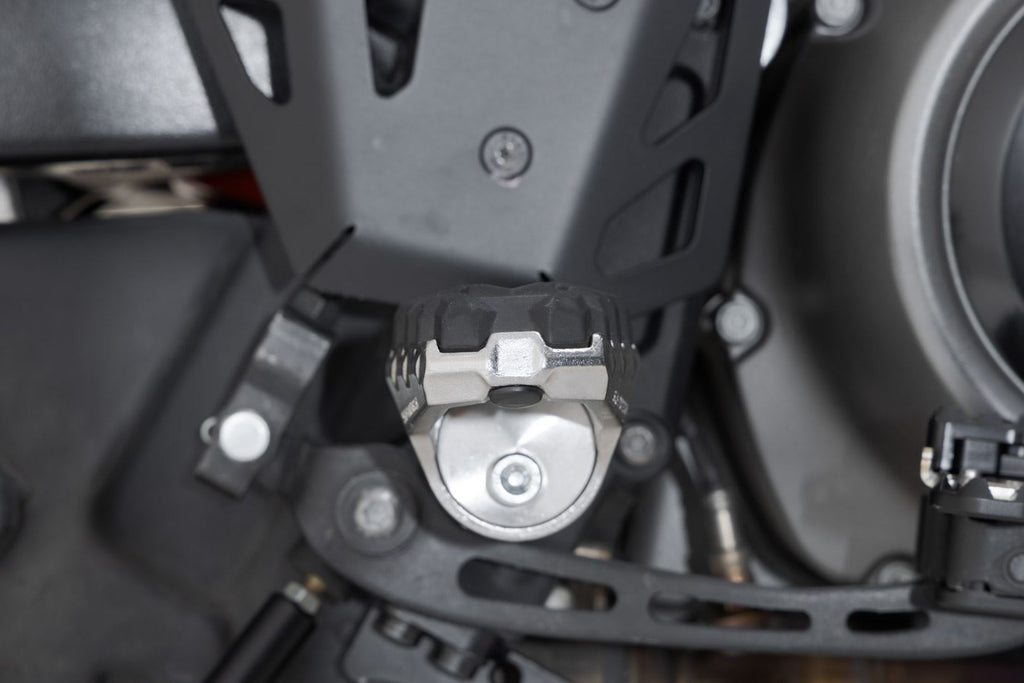 Is your original footrest impossible to position comfortably? Then the EVO footrest kit from SW-MOTECH is the perfect solution for you. This sophisticated system, consisting of rotating elements with firmly interlocking teeth, gives you 36 options for positioning. The position of the footrest can be adjusted so that it's lower or moved forwards or backwards as well as adjusted in terms of its angle to suit your individual needs. The bike-specific joint adapters are simply mounted on to the original parts of the footrest holder. We'll show you how this works in the mounting instructions.