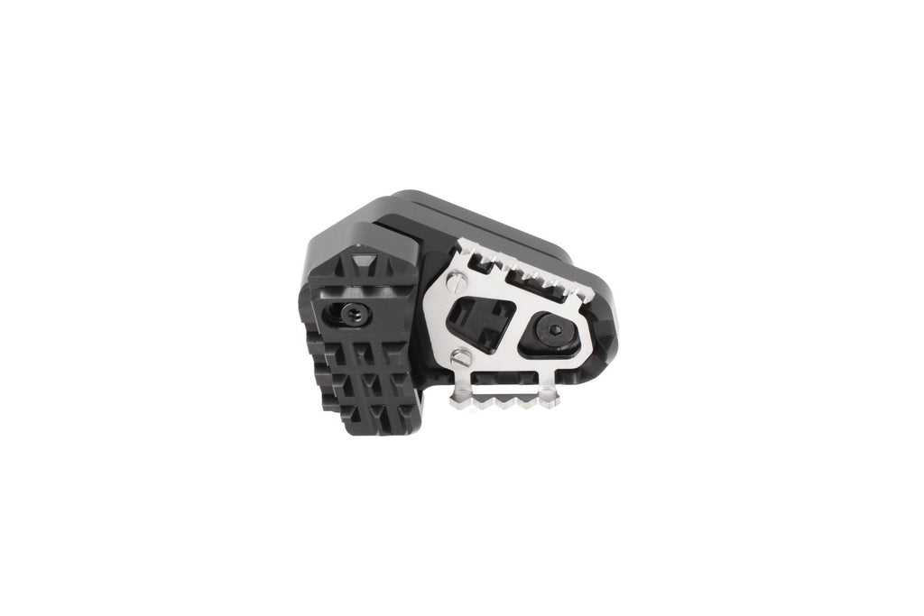 SW-MOTECH manufactures these extensions from high-strength milled aluminum alloy; they feature a black anodized surface and a stainless steel step plate. For optimal ergonomic adjustment, the increase in the brake pedal step can be adjusted in two stages of 22 or 27 millimeters.