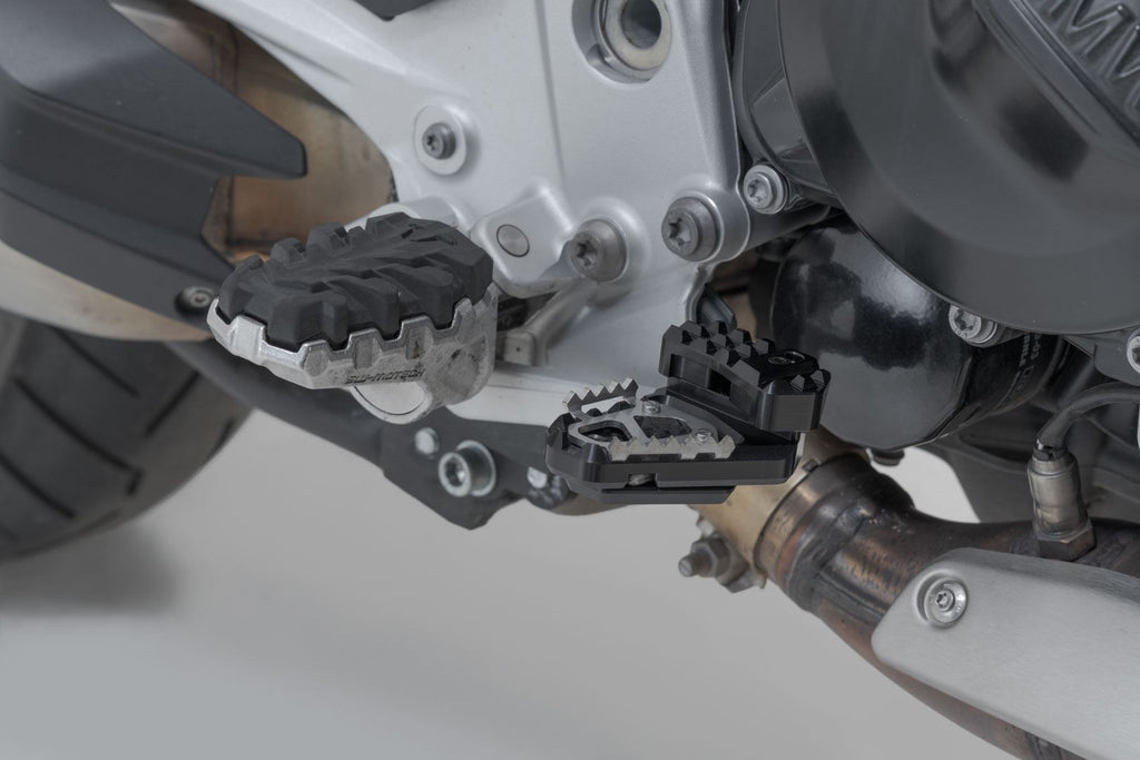 SW-MOTECH manufactures these extensions from high-strength milled aluminum alloy; they feature a black anodized surface and a stainless steel step plate. For optimal ergonomic adjustment, the increase in the brake pedal step can be adjusted in two stages of 22 or 27 millimeters.
