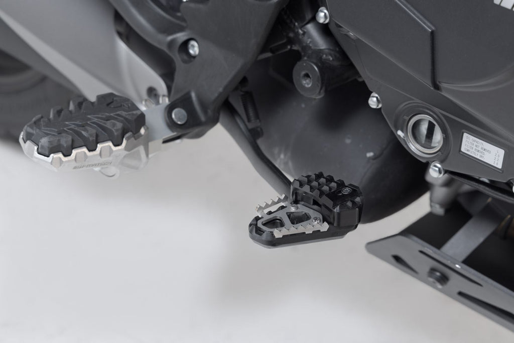 SW-MOTECH manufactures these extensions from high-strength milled aluminum alloy; they feature a black anodized surface and a stainless steel step plate. For optimal ergonomic adjustment, the increase in the brake pedal step can be adjusted in two stages of 22 or 27 millimeters.
