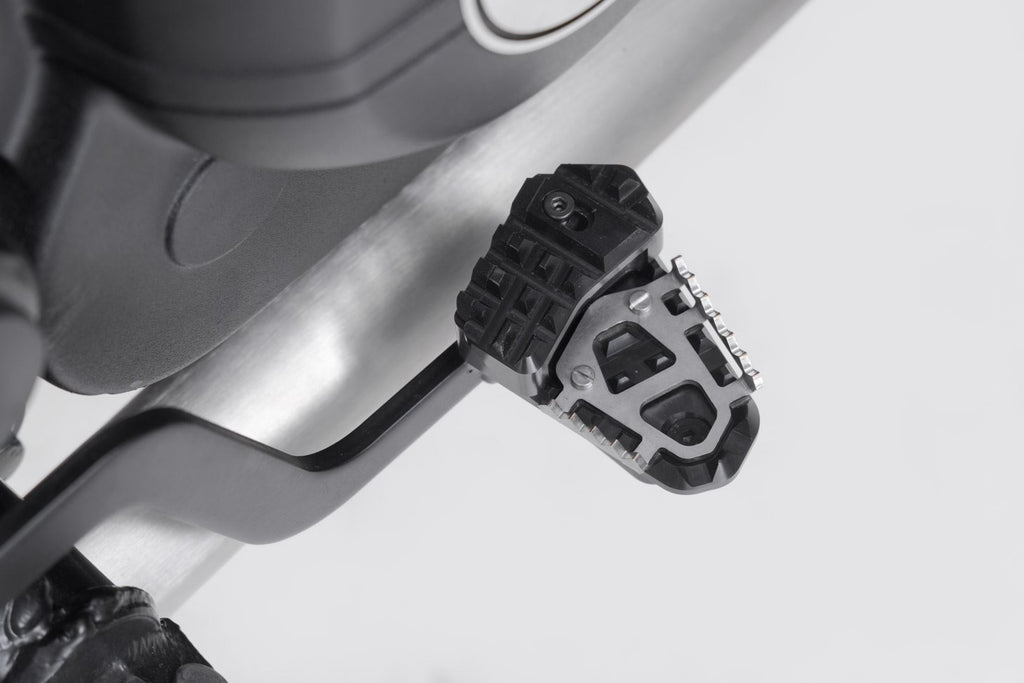 SW-MOTECH manufactures these extensions from high-strength milled aluminum alloy; they feature a black anodized surface and a stainless steel step plate. For optimal ergonomic adjustment, the increase in the brake pedal step can be adjusted in two stages of 22 or 27 millimeters.
