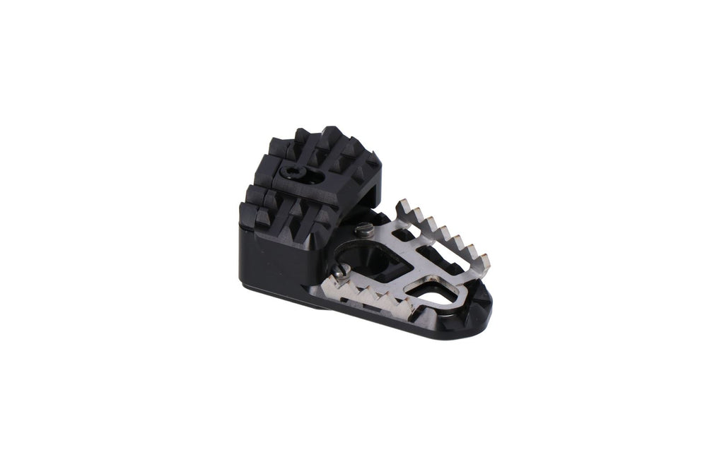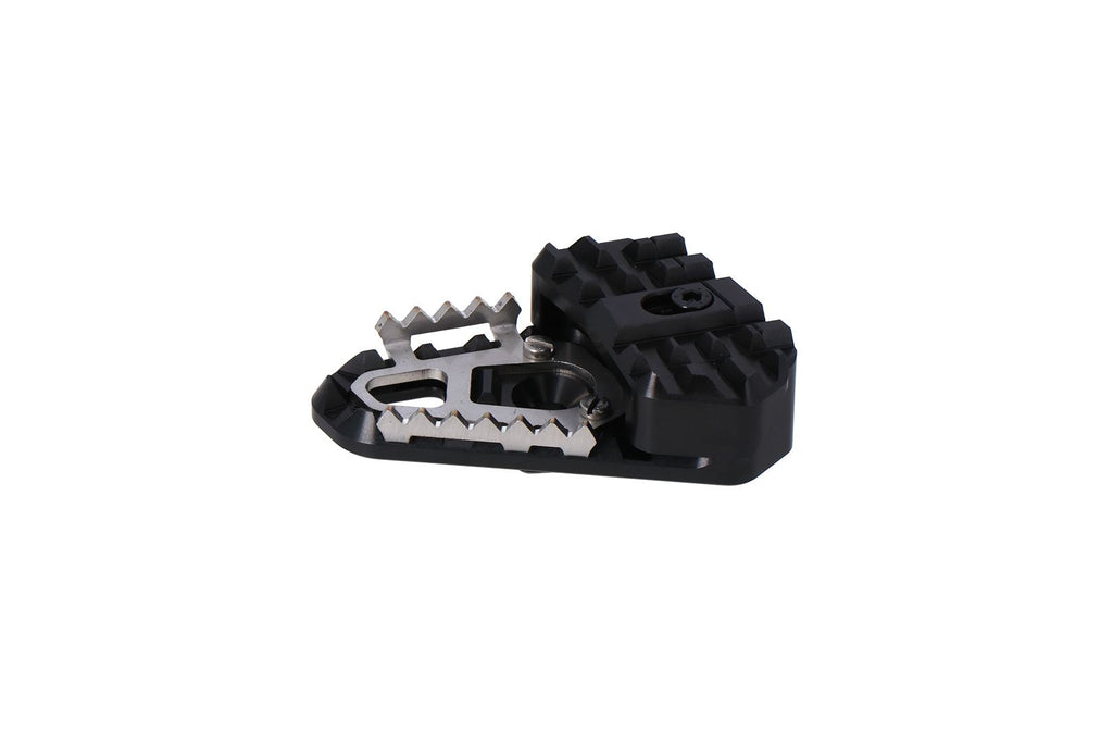 SW-MOTECH manufactures these extensions from high-strength milled aluminum alloy; they feature a black anodized surface and a stainless steel step plate. For optimal ergonomic adjustment, the increase in the brake pedal step can be adjusted in two stages of 22 or 27 millimeters.