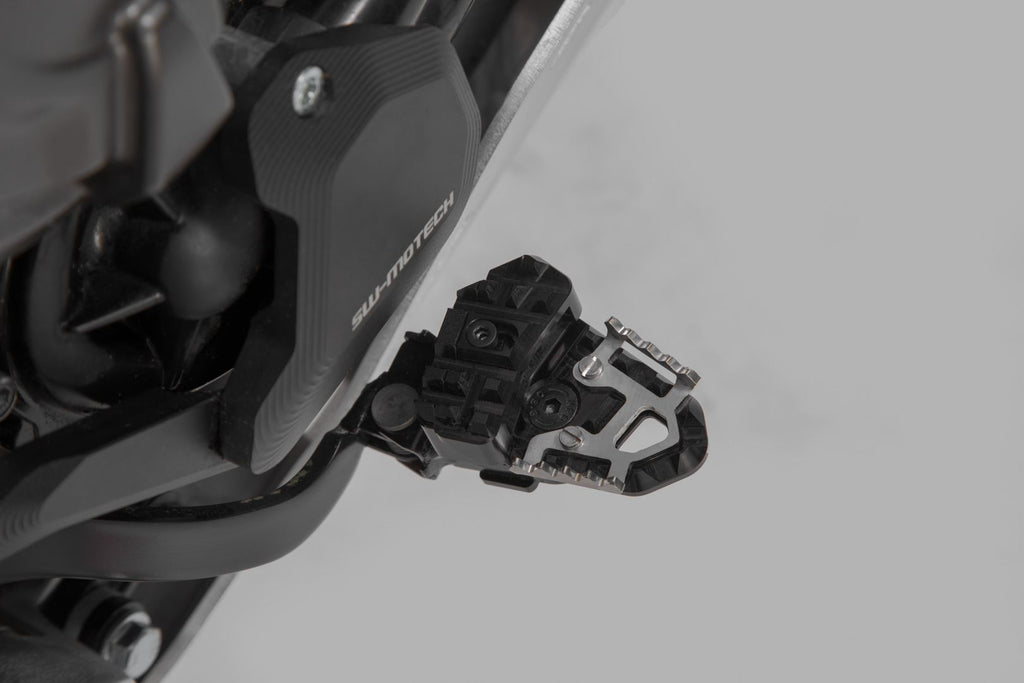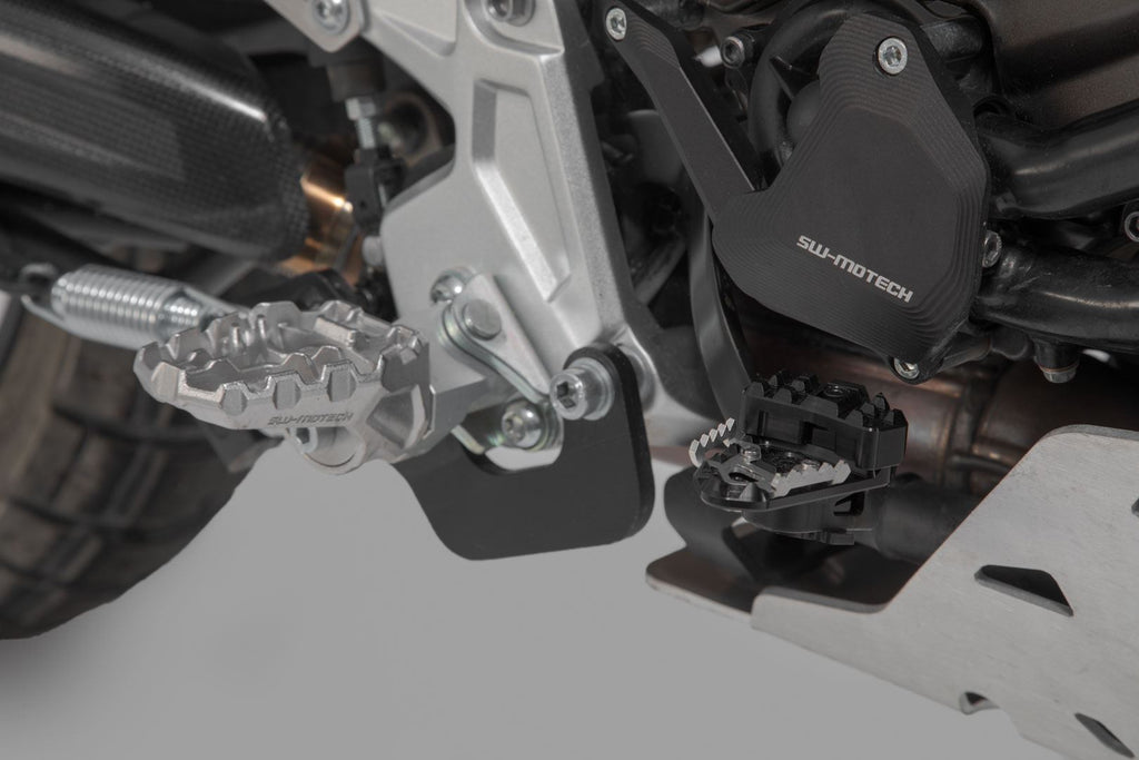 SW-MOTECH manufactures these extensions from high-strength milled aluminum alloy; they feature a black anodized surface and a stainless steel step plate. For optimal ergonomic adjustment, the increase in the brake pedal step can be adjusted in two stages of 22 or 27 millimeters.
