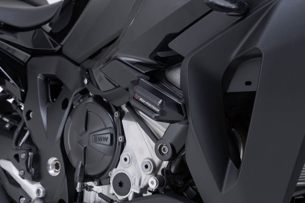 Frame crash pads provide additional protection in the event of a fall. The shape, surface and material of the pads provide excellent sliding properties to reduce damage to the motorcycle. The robust aluminium mounting bracket is easy to install, and the abrasion-resistant, CNC-milled slider pads are replaceable.