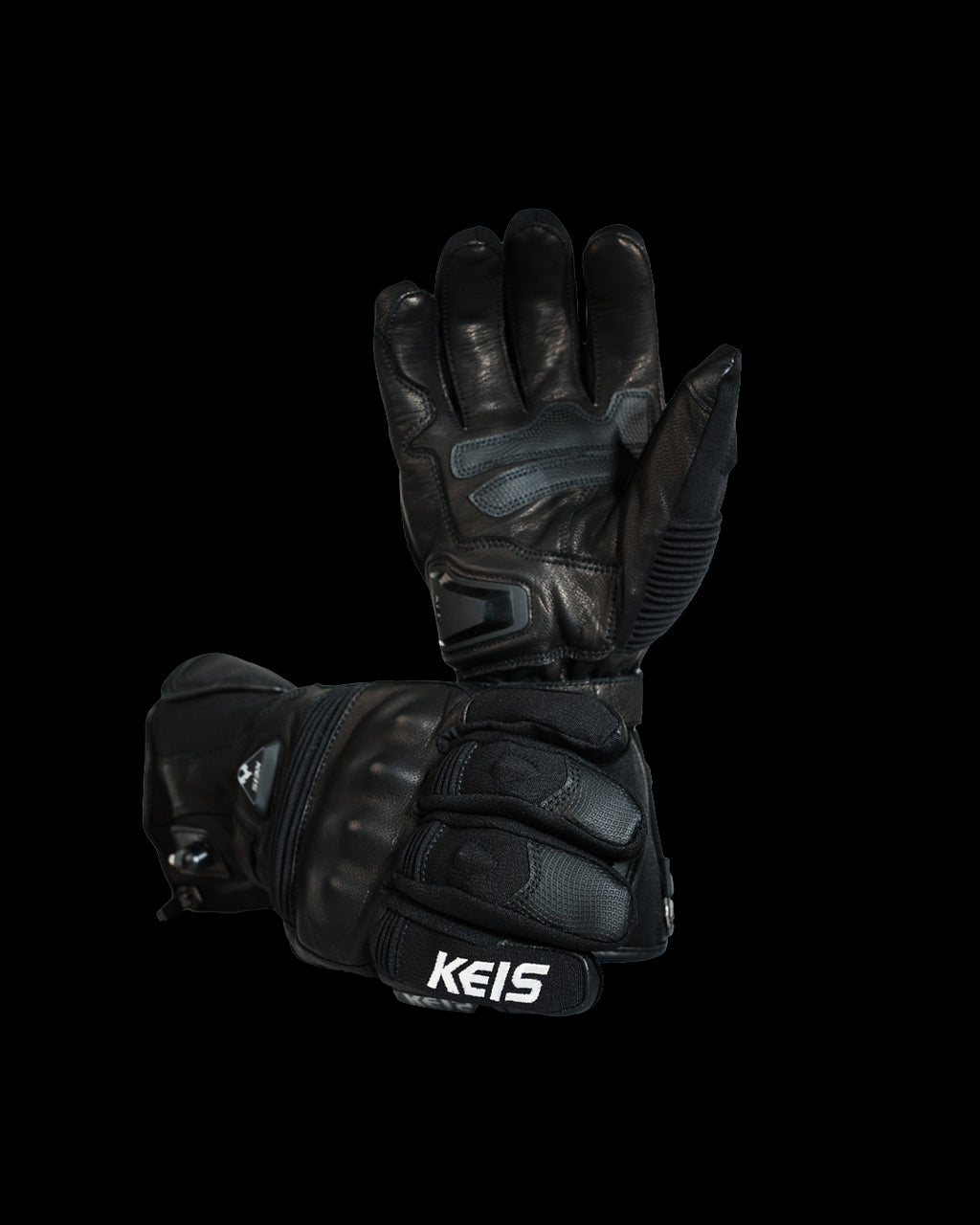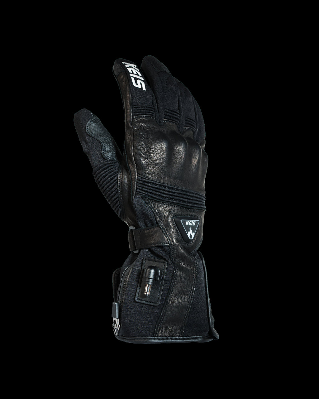 Power these heated motorcycle gloves from the motorcycle or via a Keis heated upper-body garment (a Keis heated jacket, bodywarmer, or vest)