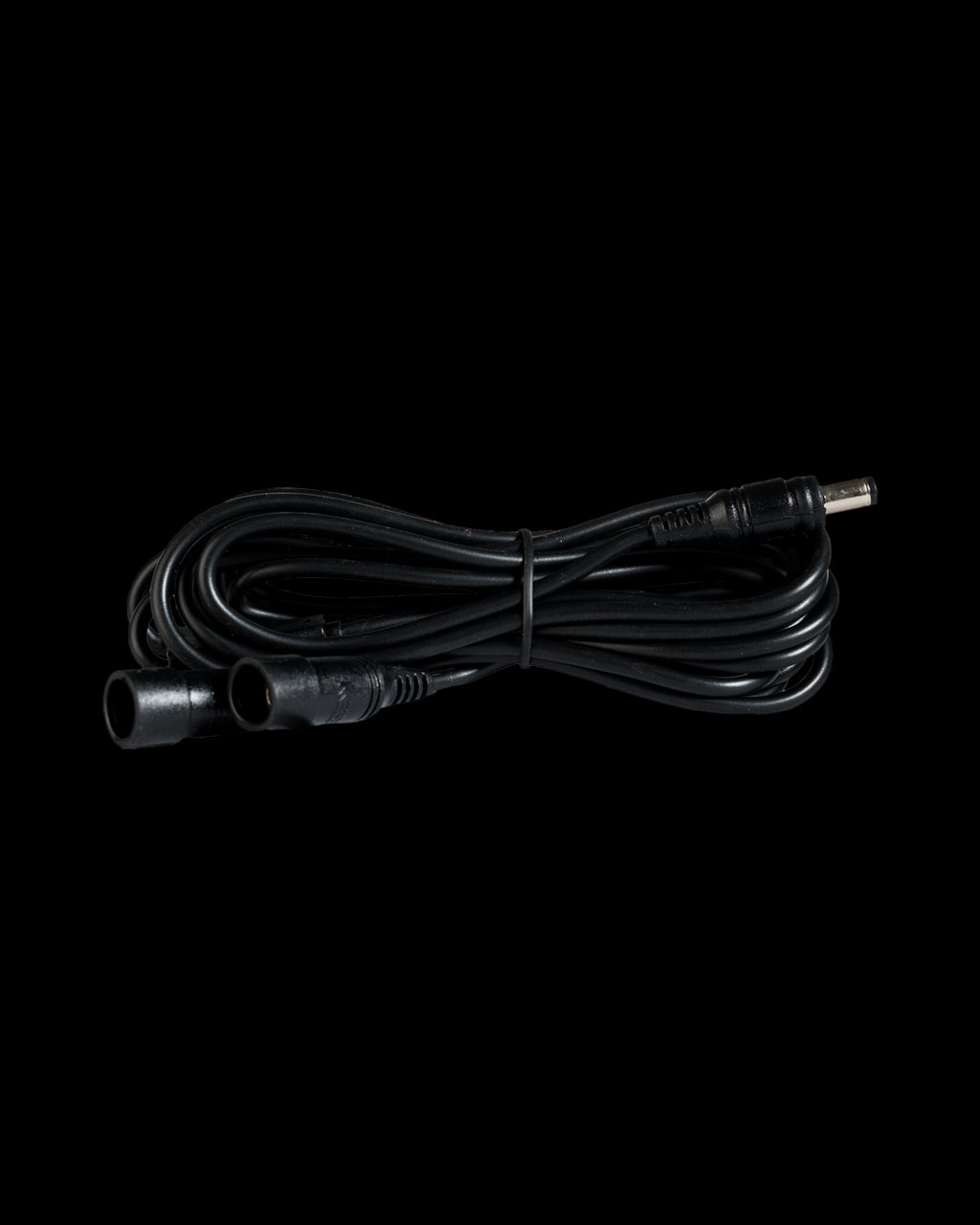 This allows for the user to connect the Keis male plug (with the short section of cable) to a power output source (portable battery, vehicle power loom, or a power output plug inside a heated vest, bodywarmer or jacket) and divert the power into and through two lengths of cable to two separate Keis 'female' power output sockets. The two long cables are of a slightly different length. This provides approximately 40 cm more cable to the garment furthest from the power source.