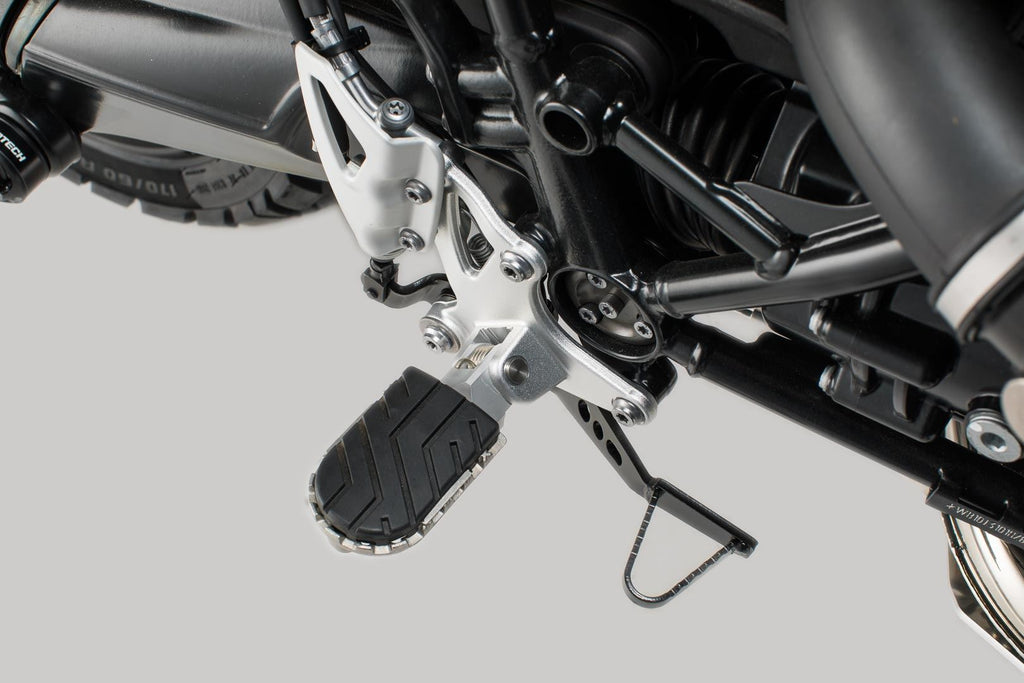 Our reasonably priced ION footrest kits allow the footrest to be mounted at its original height or lowered by 15 mm. Extremely durable and built to last, these stainless-steel footrests provide plenty of extra grip and are recommended for adventure, offroad and urban motorcycles. Hinges made from high-strength aluminum alloy ensure that the footrest can fold out of the way if the bike tips over. The removable rubber top surface reduces vibration, and the profile gives you a firm grip during offroad riding. To mount the bike-specific hinge adapter to the footrest sockets, the original attachments (springs, bolts, etc.) are used.