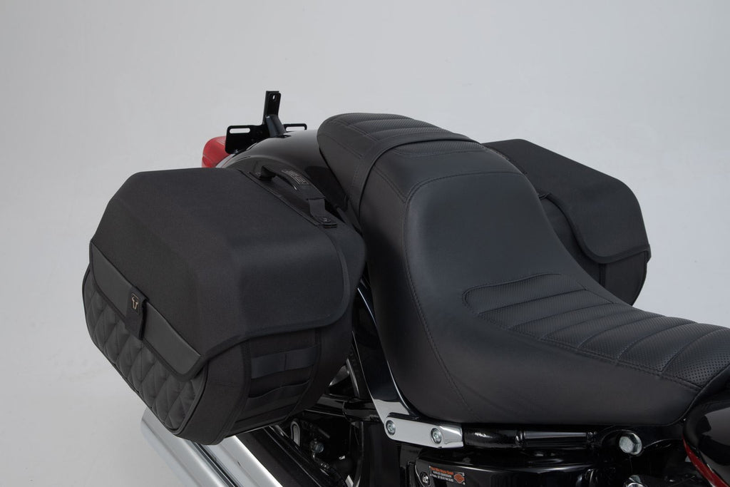 The bike-specific bag carrier can be easily and quickly mounted on to original attachment points on the fender strut. The quick lock system allows LH Legend Gear side bags to be attached and removed in just a few easy hand movements, without the driver foregoing reliable bag fastening.