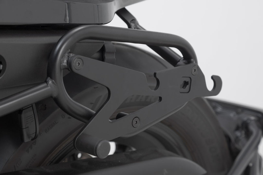 The bike-specific bag carrier can be easily and quickly mounted on to original attachment points on the fender strut. The quick lock system allows LH Legend Gear side bags to be attached and removed in just a few easy hand movements, without the driver foregoing reliable bag fastening.