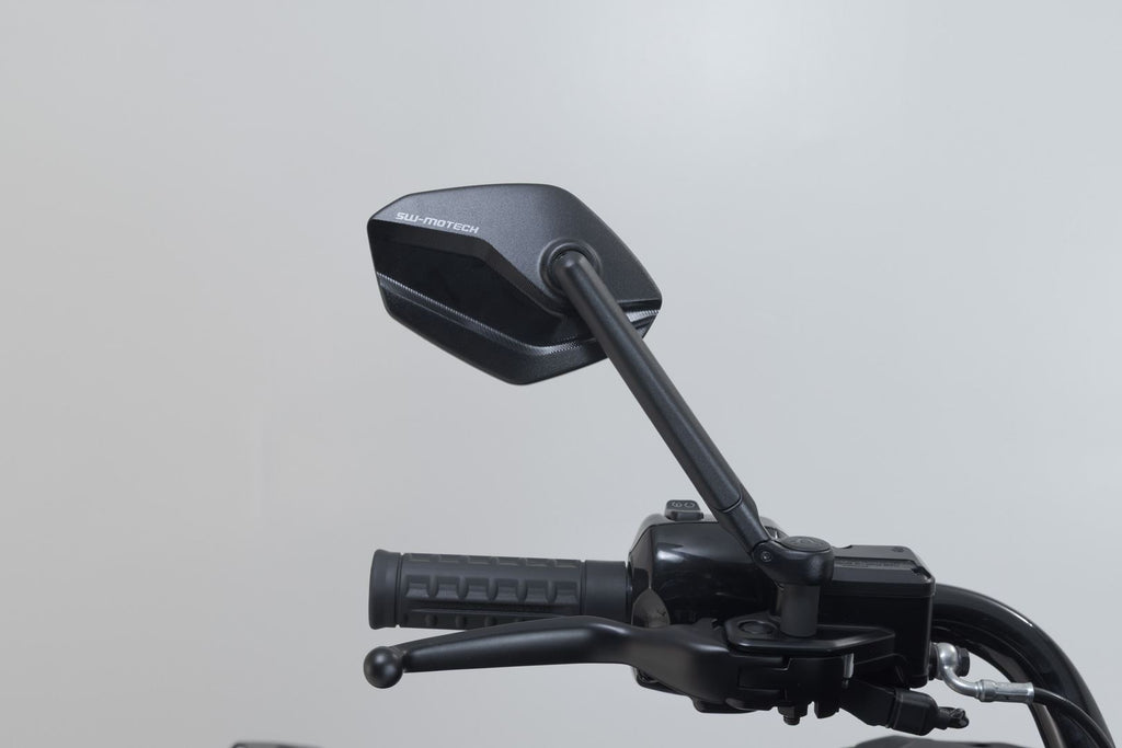 This Sport mirror set has a long mirror arm. You can install it on motorcycles with mirror mounts featuring an M8 thread. By using a spacer, which is included in the scope of delivery, this mirror set can be mounted higher on the handlebars and will not come into contact with other components.