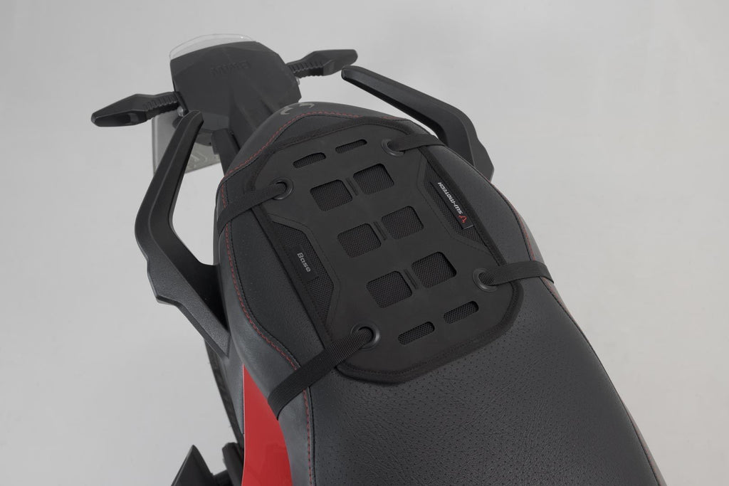 The PRO Base is the perfect solution for flexibly transporting small bags on the passenger seat. The MOLLE system made of robusthypalon fabric is stitched to a ballistic nylon base and can be attached to the seat by means of the provided lashing straps. To that end, the straps are pulled through four metal eyelets.The MOLLE system provides secure support for accessory bags such as the PRO Plus or the PRO Pocket. These can both be strapped on and attached by means of a T-Lock (available separately).