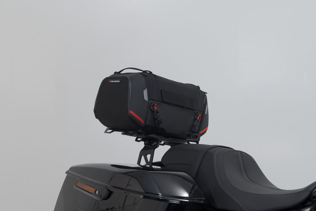 We have put together this combination of tail bag and luggage rack to fit the Harley-Davidson Road Glide. The bike-specific ADVENTURE-RACK with extension offers an ideal large contact surface for the PRO Rackpack tail bag.