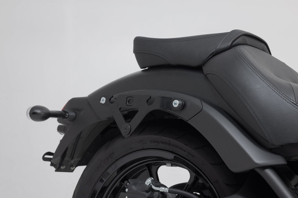 The bike-specific bag carrier can be easily and quickly mounted on to original attachment points on the fender strut. The quick lock system allows LH Legend Gear side bags to be attached and removed in just a few easy hand movements, without the driver foregoing reliable bag fastening.