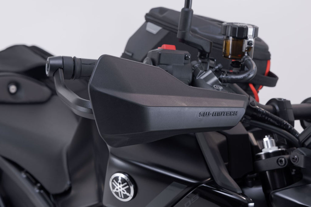 This handguard kit protects your bike's handlebar controls in the event of a fall and your hands from the elements, such as cold air and rain. The basis is a sturdy aluminum bracket to which the Sport handguard shells are attached. The shells' impact-resistant plastic is flexible and offers the excellent protection against external factors. Their slim shape and matt black look also provide a stylish design element on your handlebars. The separately available extension sets provide even more weather protection.