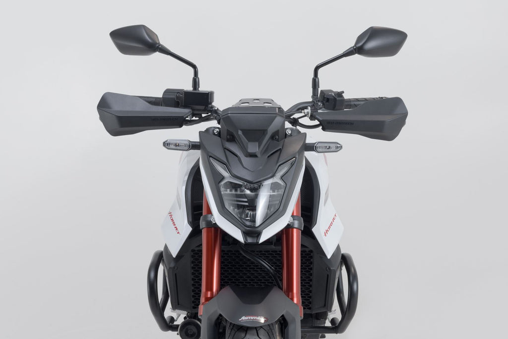 This handguard kit protects your bike's handlebar controls in the event of a fall and your hands from the elements such as cold air and rain. The basis is a sturdy aluminum bracket to which the sports handguard shells are attached. The impact-resistant plastic of the shells is flexible and offers the best protection from external influences. The slim shape and the matt black look also provide a stylish design element on the handlebar. The separately available EXTENSION SETS provide even more weather protection.