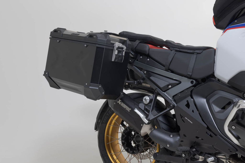 Premium meets premium: together with Akrapovic, we have put together a special set consisting of a TRAX ADV aluminium case system in black and the matching Akrapovic slip-on exhaust for the BMW R 1300 GS. The Akrapovic Slip-On improves the performance of the BMW R 1300 GS and produces the typical Akrapovic sound. In addition, the rear silencer is of high quality and looks good, just like the SW-MOTECH aluminum cases from the TRAX ADV series.With a little skill, you can assemble the slip-on system yourself and, together with the aluminum cases, you get a high-quality set. The robust TRAX ADV aluminum cases adapt perfectly to any route: embossed patterns support the stability of the 1.5 millimeter thick, welded aluminum wall material. A completely removable lid with carrying handles made from anodized aluminum and quick-release fasteners makes loading and unloading the motorcycle cases easier; the beveled side edge provides high ground clearance when cornering. With this complete solution, you have all the components you need to go on a long journey with TRAX: two waterproof TRAX ADV side cases, two removable SW-MOTECH side carriers, an adapter kit, a lock set, a lid limiter and anti-theft protection at an attractive overall price. The bike-specific carriers and size of the cases are designed to perfectly match the shape of the tail as well as the motorcycle's exhaust system.A motorcycle case without compromise: When developing the TRAX ADV, the focus was on stability and tightness against dust and water, as well as easy handling. Whether it's an off-road adventure, a wanderlust tour, or a short trip, the premium aluminum cases with a wall thickness of 1.5 millimeters prove themselves in every challenge.