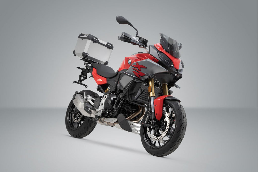 The TRAX ADV top case system consists of a robust silver anodized top case and a matching STREET-RACK for the BMW F 900 R and XR.