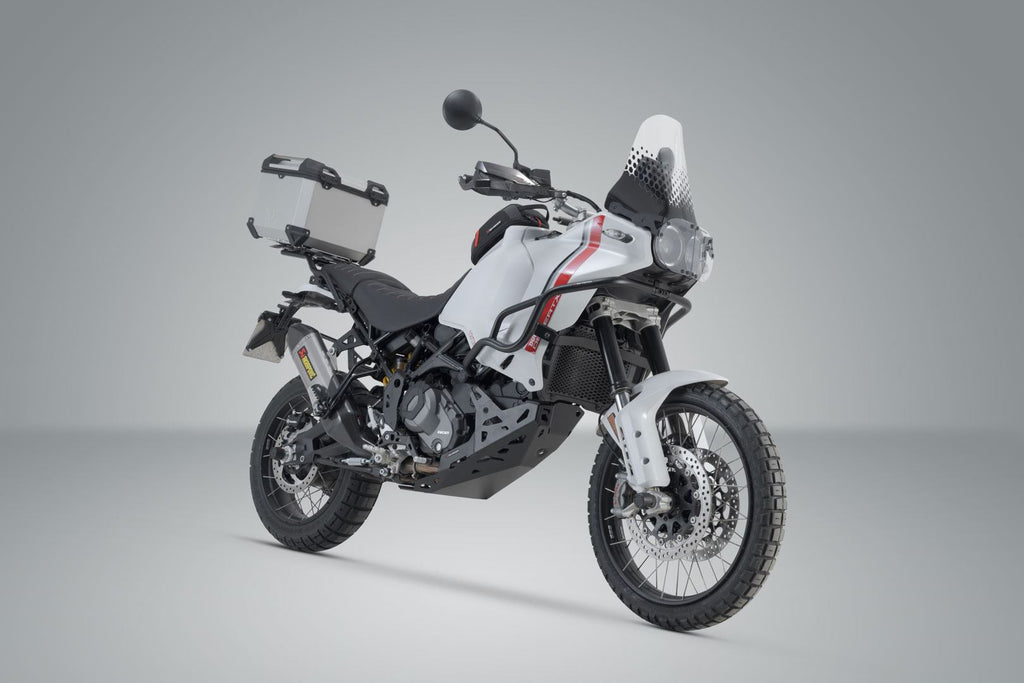 The TRAX ADV top case system consists of a rugged silver top case and the matching ADVENTURE-RACK for the Ducati DesertX.