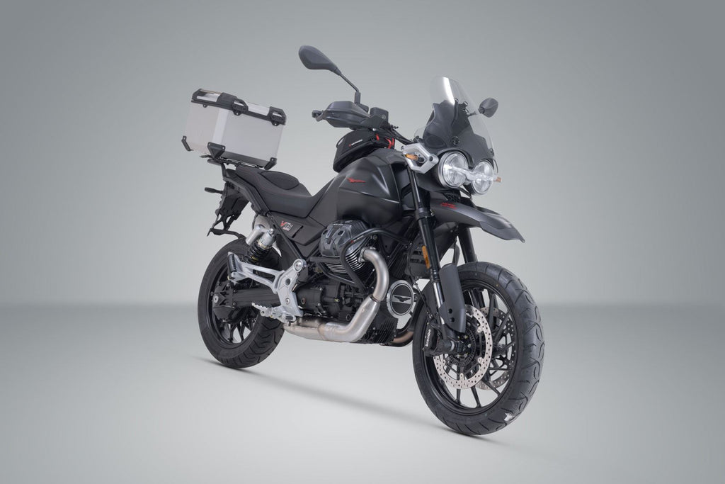 The TRAX ADV top case system consists of the robust silver top case and the matching ADVENTURE-RACK for the Moto Guzzi V85 Strada.