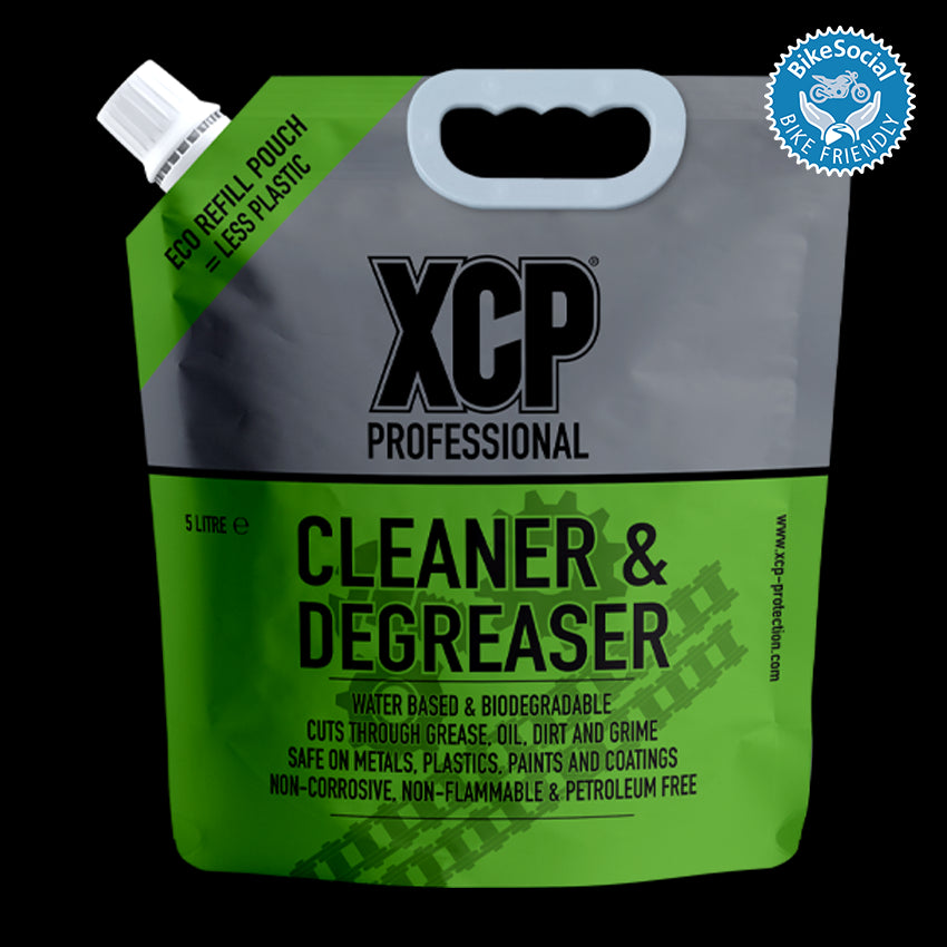 Award winning, high performance cleaning & degreasing spray. Water based and biodegradable. Safe to use on metals, paints and coatings. Use it neat as a degreaser, or dilute it for use as a bike wash or general purpose cleaner. Cuts easily through oil, dirt, grease and grime! Available in reusable 1 ltr trigger bottle and in our 5 ltr eco-refill pouch. Use as a degreaser Apply product neat to the surface that requires degreasing. The liquid can also be used as a degreasing soak (bath) for a few minutes, before cleaning off. Agitate with brush or sponge. Rinse with clean water. (Optional) Lubricate and/or protect surfaces with your preferred XCP® Professional spray, as necessary. Use as a cleaner Dilute 1 part XCP® CLEANER & DEGREASER with up to 10 parts water (select according to strength of cleaning power). Spray surfaces with diluted mix and allow to soak for a few minutes. Agitate with brush or sponge. Rinse with clean water. (Optional) Lubricate and/or protect surfaces with your preferred XCP® Professional spray, as necessary.